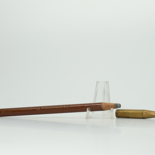 A brass pencil with a wheel at the end to adjust the length of the product. The pencil is engraved with three crowns, then text reading, "Scandia / Brown."