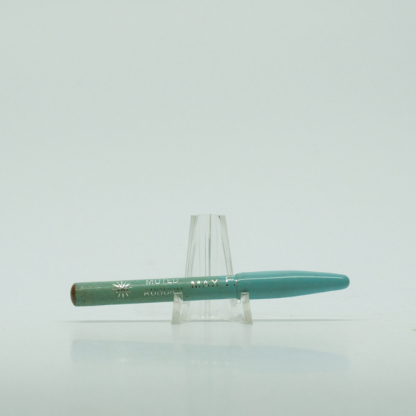 A light blue wooden pencil and light blue cap embossed with silver text reading, "Muted Auburn / Max Factor / U.S.A." The pencil can be accessed by removing the lid.