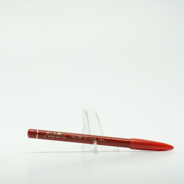 A reddish-colored black eyeliner pencil with plastic lid and text on its side reading, "Velvet Black / Maybelline / Maybelline Co. Distr. Chicago, IL / Made in / U.S.A."