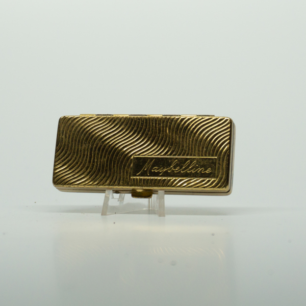 A rectangular brass mascara container with an organic texture and, "Maybelline," engraved on its top. To access the product, the container opens on a hinge with a finger ridge. Inside, there is an application brush and a pamphlet reading, "Maybelline…