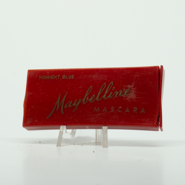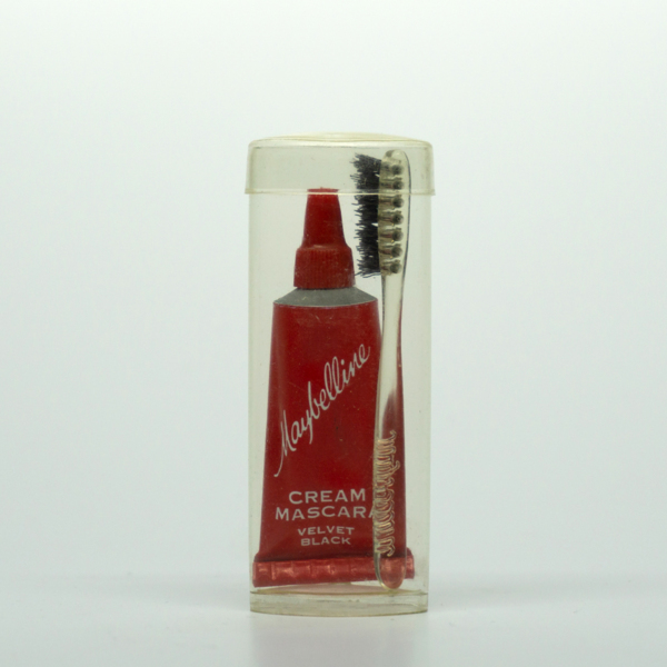 A red and white aluminum tube in a plastic cylindrical container with an applicator brush. The rube reads, "Maybelline Cream Mascara / Velvet Black," and the back reads, "Directions - Spread thin line of mascara on dry brush, work into bristles.…