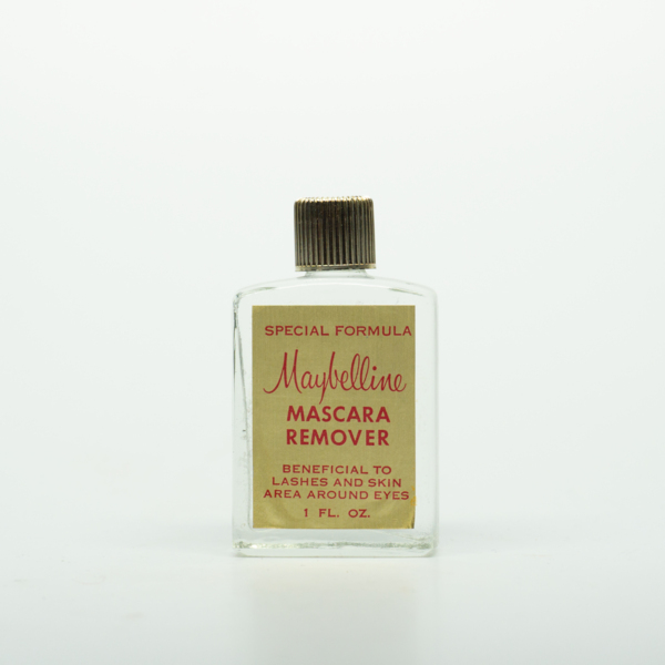 A rectangular glass bottle with a black plastic cap and paper labels on the front reading, "Special Formula Mascara Remover / Beneficial to lashes and skin area around eyes / 1 fl. oz.," and on the back reading, "This pure harmless formula gently and…