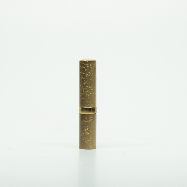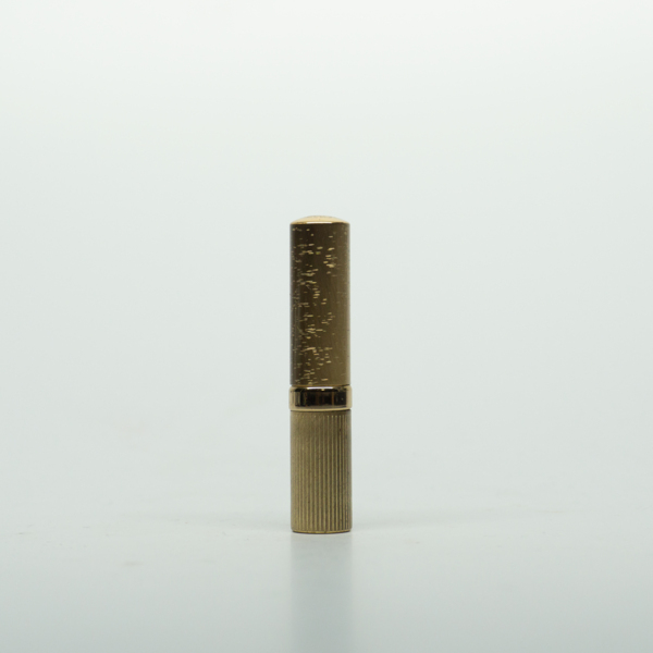 A brass lipstick tube with an embellished ring around its center below the bottom of the lid. The lipstick can be accessed by removing the lid and twisting the tube. A shade label on the bottom of the tube reads, "Lanolite / '64' / 'Snow Peach' /…