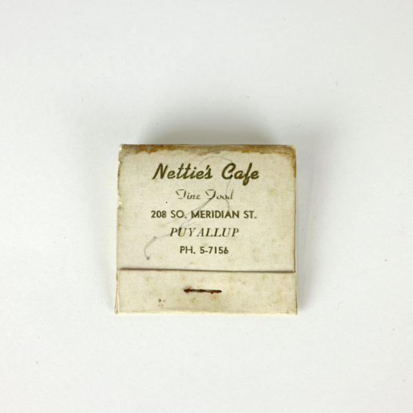 A white rectangular container printed with a promotional message for, "Nettie's Cafe Fine Food / 208 SO. Meridian St. / PUY ALLUP / PH. 5-7156" The container can be opened by lifting the top from underneath a tab at the bottom of the container.…