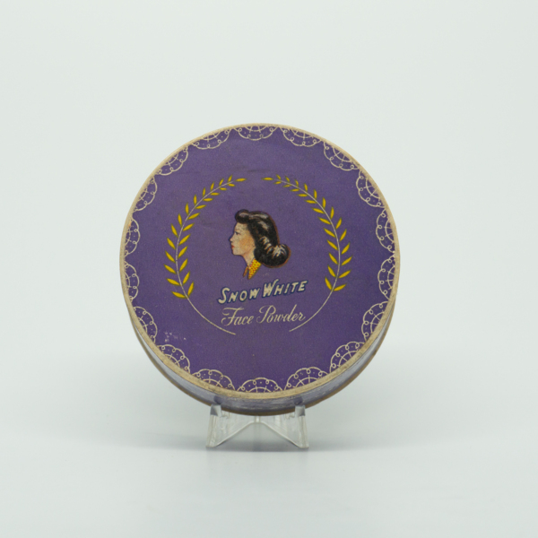 A cylindrical powder box with a purple background decorated with graphic lace and filigree. At the center of the powder box top is a feminine figure in profile, text under the figure reads, "Snow White Face Powder." The box can be opened by gently…