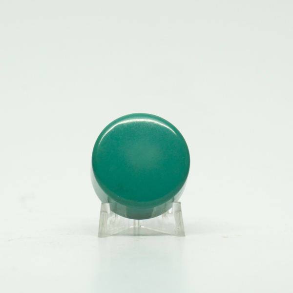 A circular teal container. The container can be opened by twisting the top. Inside the container is a lip pomade. A shade label on the bottom reads, "Elizabeth Arden / New York - Paris - London / Stop Red."