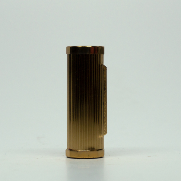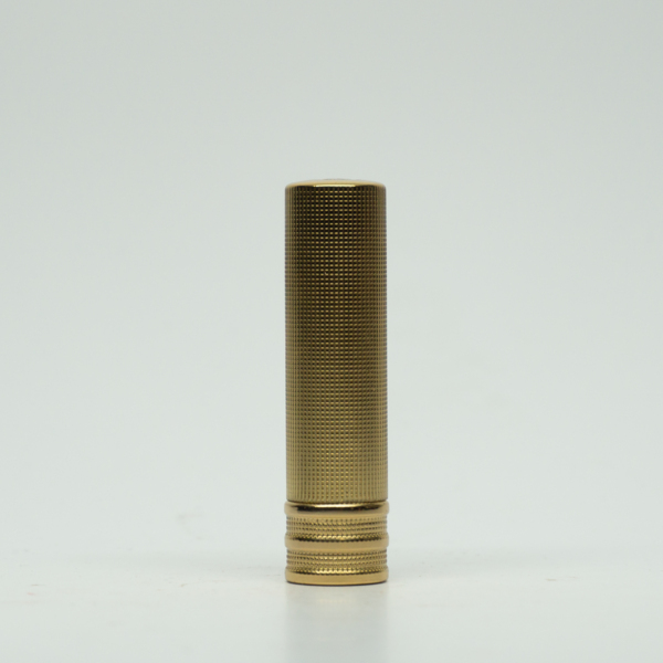 A brass lipstick tube with vertical lines textured on its lid. The bottom of the tube is embellished with a lace like finish. The lipstick can be accessed by removing the top and twisting the tube. A shade label on the bottom of the tube reads,…