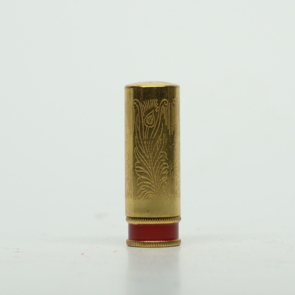 A cylindrical brass tube engraved with a floral motif. The lipstick can be opened by lifting the top from the red enamel stripe at the base. The top is stamped, "Kissproof," and the bottom is stamped, "Affiliated Products Inc. Distributors Jersey…