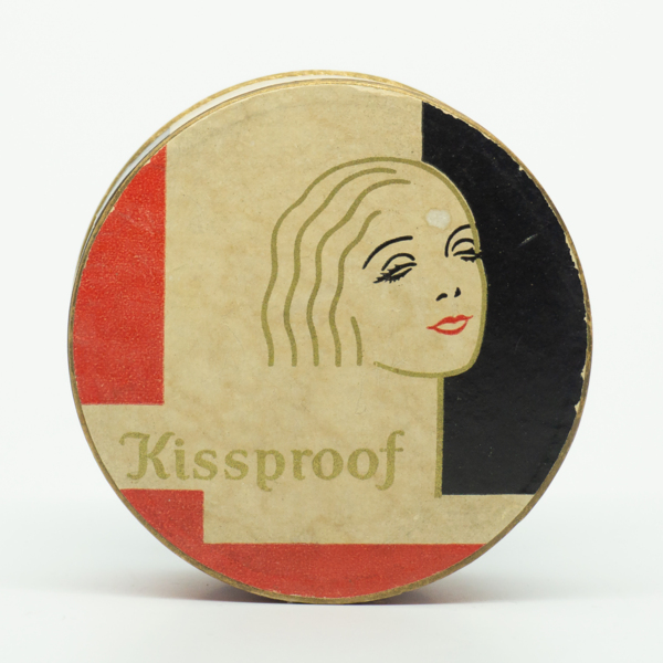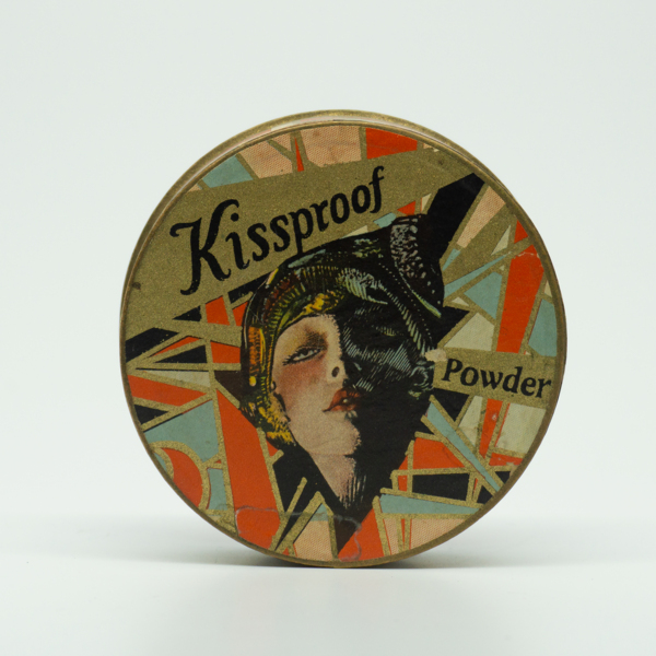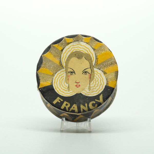 A round container printed in red, brown, white and black featuring a feminine figure wearing a gown in profile surrounded by a floral garland on its lid. Text reads, "Light Face Powder." A product description on the bottom reads, "[text obscured]…