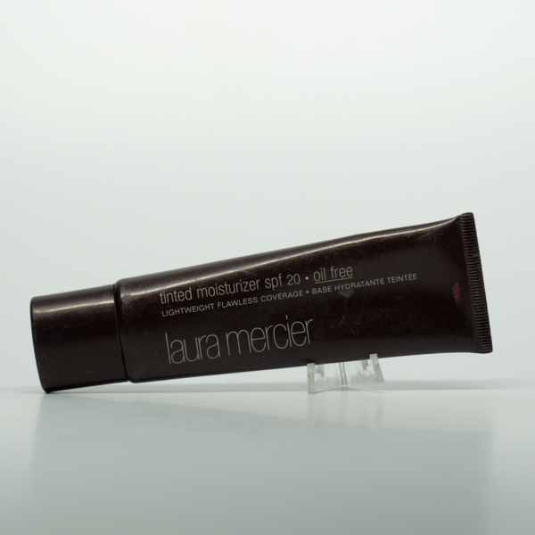 A black plastic tube with white text reading, "tinted moisturizer spf 20 oil free/ lightweight flawless coverage / Laura Mercier." The back of the tube contains more information, "Perfect for all skin types. Laura Mercier oil free tinted moisturizer…