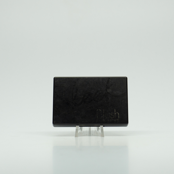 A black plastic compact opening at a hinge with a finger ridge. Inside the compact are a mirror and a pressed powder blush. The back label contains more information on the product, "Ingredients: Mica, Talc, Bis-Diglyceryl Polyacylacipate-2,…