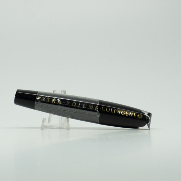 A tapered cylindrical tube with gold text on the front reading, "Extra-Volume Collagene," with additional text on the back, "L'Oreal / Hydra-Collegen Instant Volume." A barcode sticker is on the tube with the shade name, "Noir/Black."