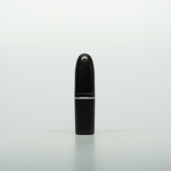 A black plastic twist-up lipstick with the label, "M.A.C.," at the bottom of the lid where the lid can be removed. On the bottom of the tube text reads, "Makeup Art Cosmetics - Toronto - London WIK 380 - Made in USA - MCF3 / Cremesheen Brave Red."