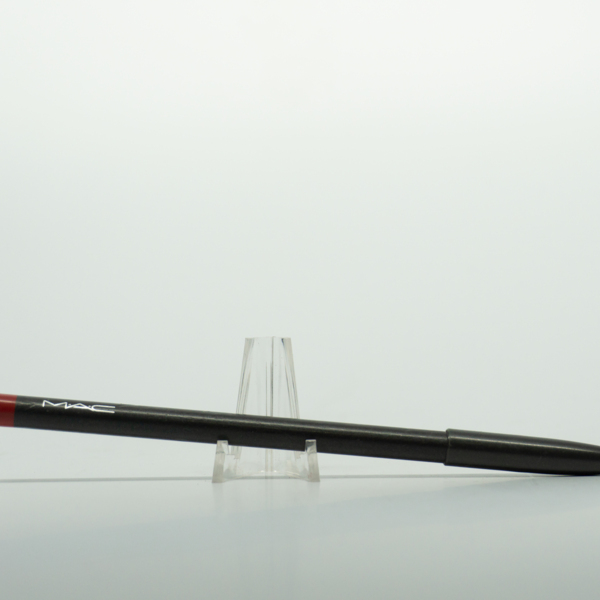 A black wood lip lining pencil with a plastic cap. The end of the pencil is a red close to the product shade. The pencil is embossed with the MAC logo. The pencil has more information embossed in the same silver typeface, "Cherry Lip Pencil / Net.…