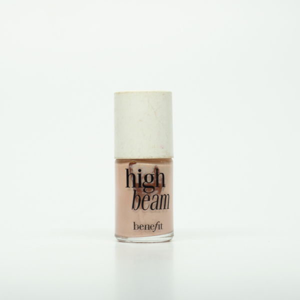A cylindrical glass jar with a plastic twist-off lid. The lid is attached to a doe foot applicator. Inside the glass bottle is the pink luminescent complexion enhancer. On the front of the product, black enamel lettering reads, "High Beam / Benefit."…