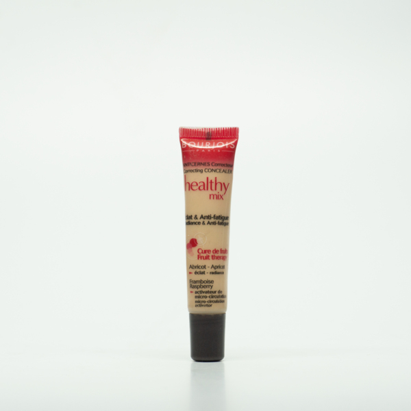 A clear plastic squeeze tube with red and black graphics. The front of the tube reads, "Bourjois Paris / Correcting Concealer / Radiant and anti-fatigue / fruit therapy / Apricot / Raspberry / micro circulation activator." The back of the tube has…