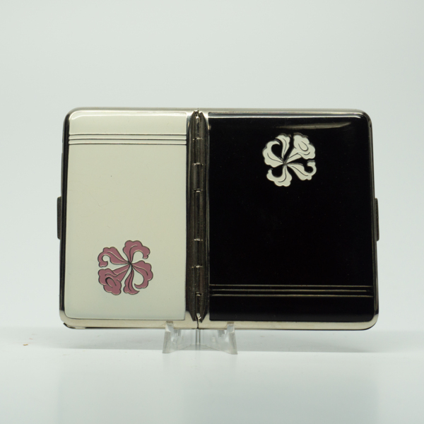 A double compact with a black and white enamel top decorated with two small floral decorations, one pink, one white. The compact has a large hinge in the center of its top. There are two compartments. One compartment has a bill holder, and the other…
