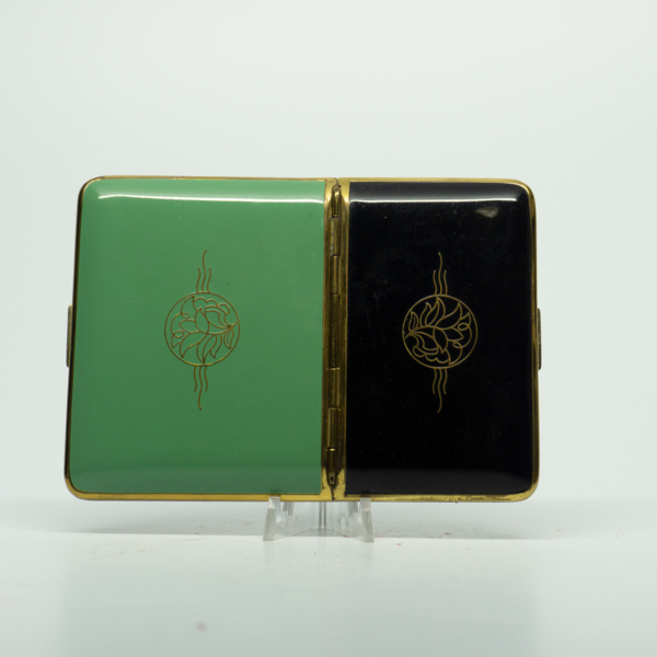 A double compact with a black and green enamel top decorated with two small floral decorations. The compact has a large hinge in the center of its top. There are two compartments. One compartment has a bill holder, and the other compartment has a…