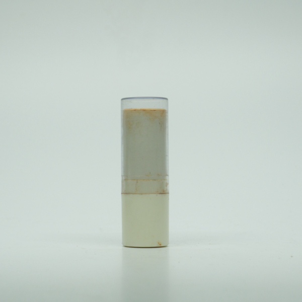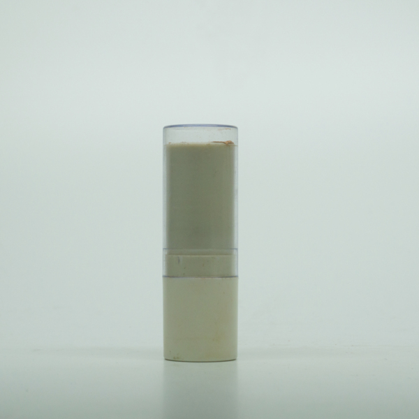 A plastic tube with a transparent lid containing a cream stick foundation. The bottom of the rube has a sticker label reading, "Bob Kelly Cosmetics Inc. / Creme Stick / Fairest / Net. Wt. 1/2 oz. 14.17 G / F 15 C."