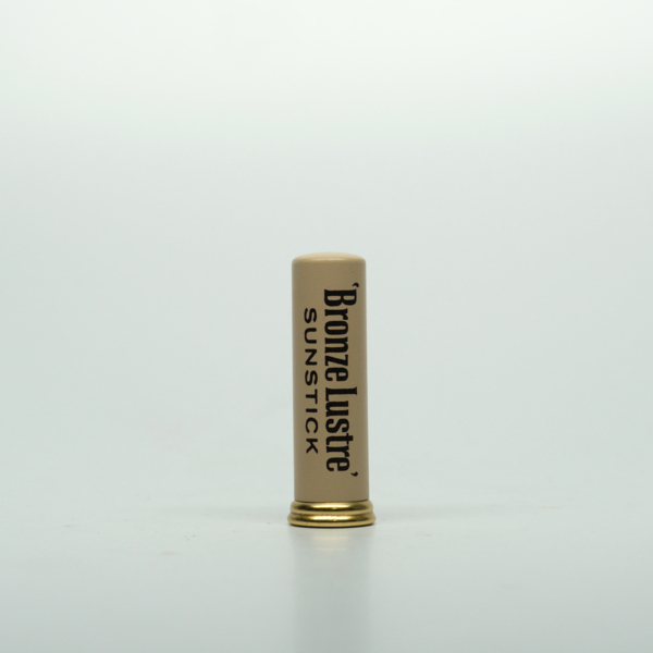 A brass tube with a in beige enamel lid and black text reading, "'Bronze Lustre' Sunstick." The Sunstick can be accessed by removing the lid and twisting the bottom. A shade label on the bottom of the tube reads, "09 / Pink Gloss / 'Bronze Lustre'…