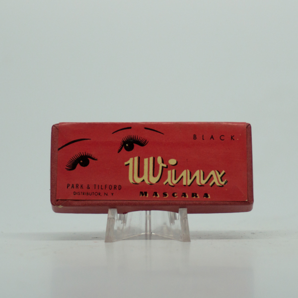 A red cake mascara container with black and yellow graphics. A pair of eyes with full eyelashes on its top. The shade is printed on the top right, "black." Text printed at the center reads, "Winx Mascara / Park & Tilford / Distributor, N.Y." The cake…