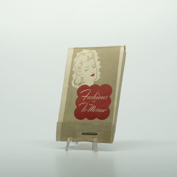 A rectangular cardboard package printed with a white, red and gold feminine graphic above a red text bubble with white script that reads, "Fashions of To-Morrow." The container can be opened by lifting the front of the container from underneath a…