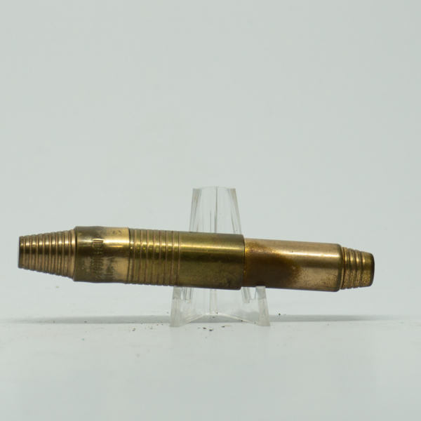 A tapered brass brush with lid. The brush is decorated with concentric circles. Text stamped on the lid reads, "Charles Mureau / Made in U.S.A."
