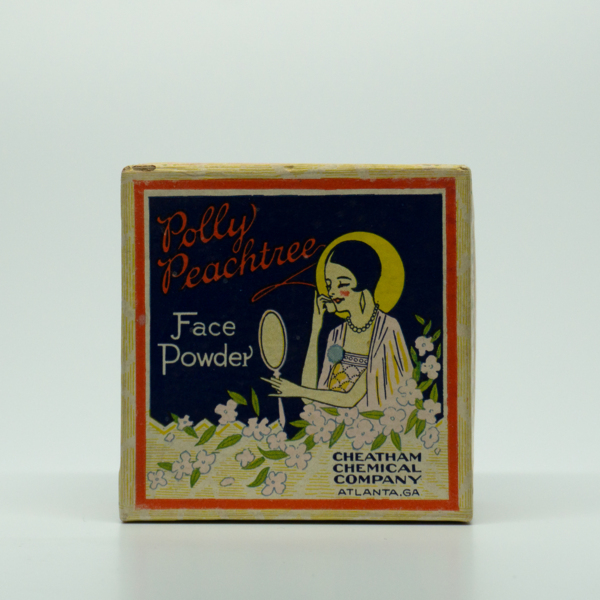 A rectangular red, yellow, blue and green container featuring a feminine figure reflecting on her face with a hand mirror in a garden on its lid. Text around the figure reads, "Polly Peachtree / Face Powder / Cheatham Chemical Company / Atlanta, GA."…