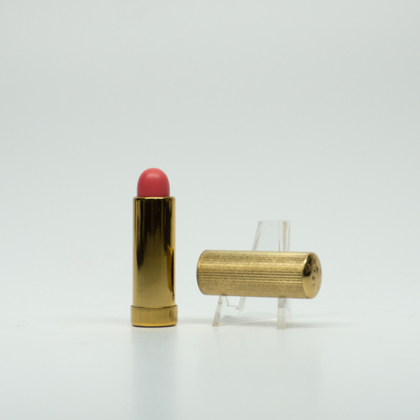 A brass tube engraved with a linear design and text reading. "Cheekstick." The Cheekstick can be accessed by removing the top and twisting the bottom, The bottom of the stick has a shade label reading, "Cheekstick / No. 4 / Pink / 65 / Revlon N.Y.…