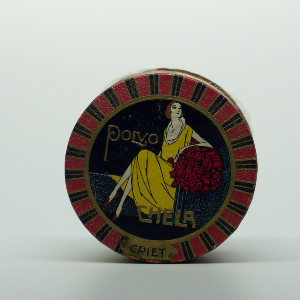 A circular red, blue and yellow container printed with an art deco design featuring a reclined figure next to a bunch of roses. Text around the figure reads, "Polvo / Chela / Griet." A shade label on the bottom is printed in Spanish.