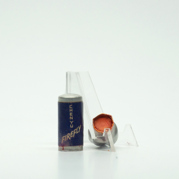 A small, aluminum lipstick tube. The lid is covered with blue enamel and white text reading, "Chen Yu / Firefly." The lipstick can be accessed by removing the top.