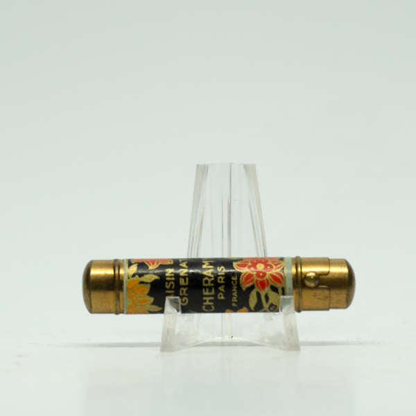 A brass tube with a blue label featuring a floral motif and light-green text. The text reads, "Raisin / Grenat / Cheramy / Paris - France." The tube can be opened by lifting the top from the base. The product can be moved up and down with a finger…