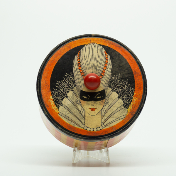 A round container printed in red, black, white and tan featuring a masquerade figure on its top. A red plastic knob sits at the center of the lid and visually corresponds to the masquerade figure's head piece. A product description on the bottom…