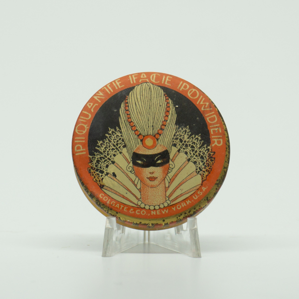 A round container printed in red, black and whtie featuring a masquerade figure on its top. Text around the figure reads, "Piquante Face Powder / Colgate & Co., New York, U.S.A." A product description on the bottom reads, "Purse Size / Naturelle /…