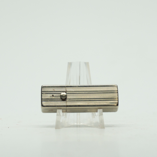 A silver rectangular lipstick case with, "Coty," engraved on its top. The component can be opened by lifting the top from the base. A toggle moves the product up and down.