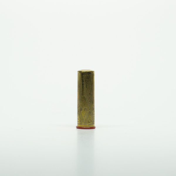 A brass lipstick tube with a red enamel accents. The lid of the tube is engraved with an architectural pattern. The top of the lid has text reading, "Coty / New York." The lipstick can be accessed by removing the top and twisting the bottom. The…