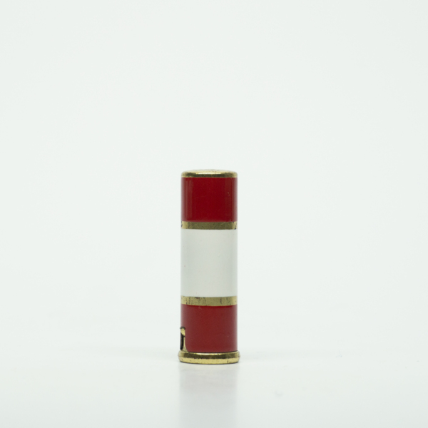 A brass lipstick tube with red and white enamel stripes sepated by a gold ring. The lipstick can be accessed by removing the top and sliding up the outer button.