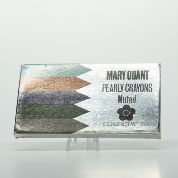 A metallic cardboard sleeve printed with crayons the same color as the product. Metallic text reads, "Mary Quant / Pearly Crayons / Muted." The back of the sleeve is printed with a description of the product in many languages. Inside the sleeve is a…