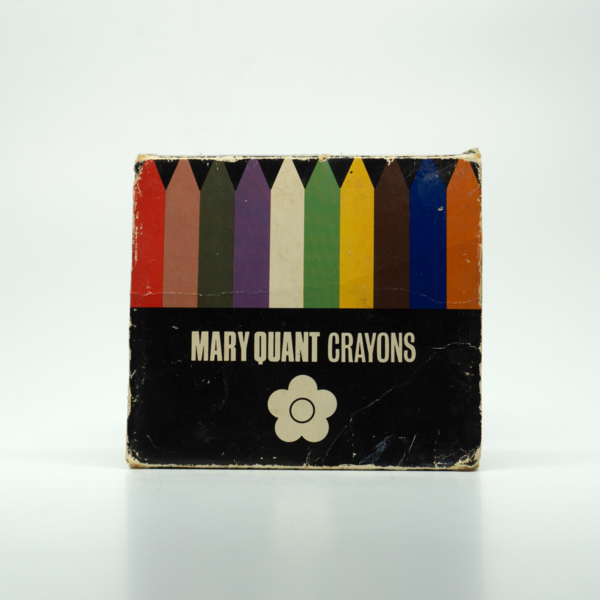 A black cardboard sleeve printed with crayons in the colors of the product. White text reads, "Mary Quant Crayons," above the trade mark Mary Quant Daisy. The back of the box contains descriptions of the products in multiple languages. The English…