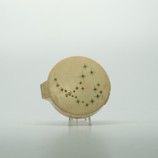 A white plastic compact with gold stars covering the top. The sticker label on the bottom of the compact reads, "Max Factor Hollywood / Creme Puff / Compact Make-Up / Candle Glow (Medium) / Net. Wt. 1/4oz. / Made in U.S.A."