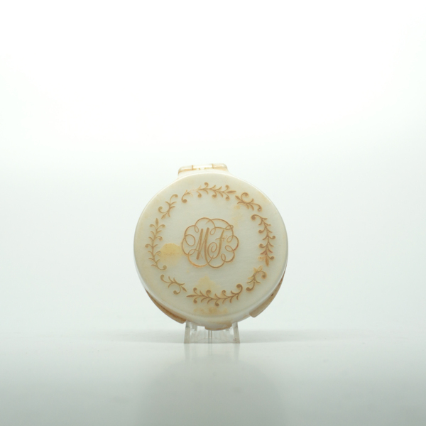A white plastic compact with gold embellishments surrounding a Max Factor logo. The compact opens on a hinge. Inside is a mirror the width of the top of the compact, a puff with a tape label reading, "Mae," and pressed powder. The sticker label on…