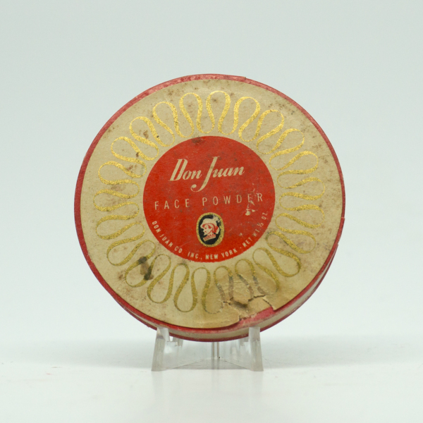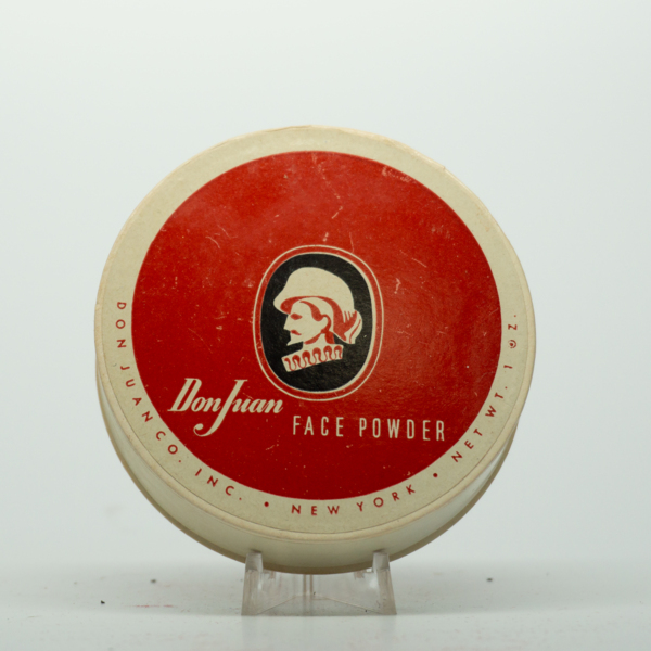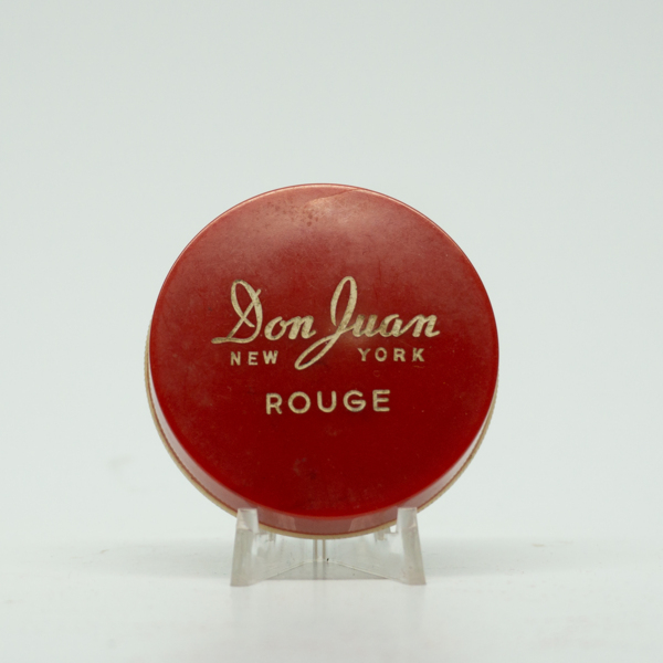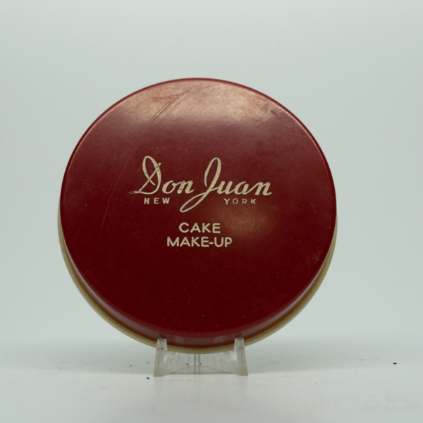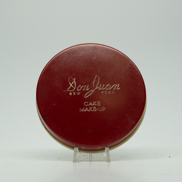 A circular red plastic container with white text reading, "Don Juan / New York / Cake Make-Up." The container can be opened by twisting the top. A shade label on its bottom reads, "Glamorous New Cake Make-Up / Don Juan Cake Make-Up gives a flattering…