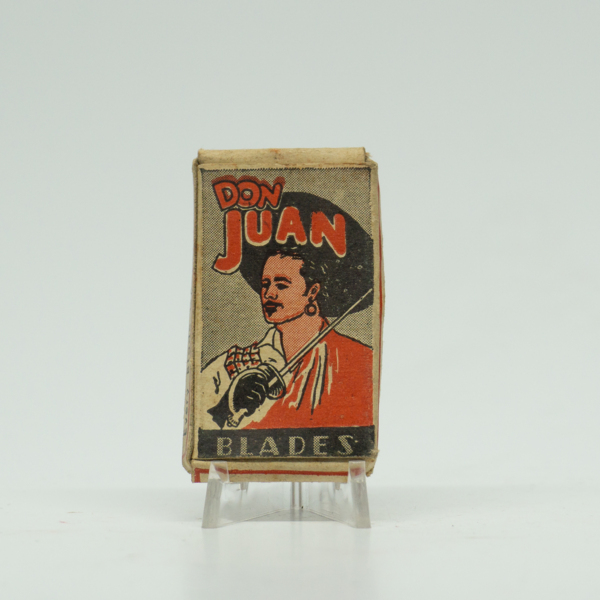 A cardboard container featuring a red, black and white image of a masculine figure with a sword. Text surrounding the figure reads, "Don Juan / Blades." More text on its side reads, "Don Juan Blade Co., N.Y., N.Y."
