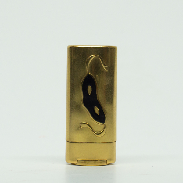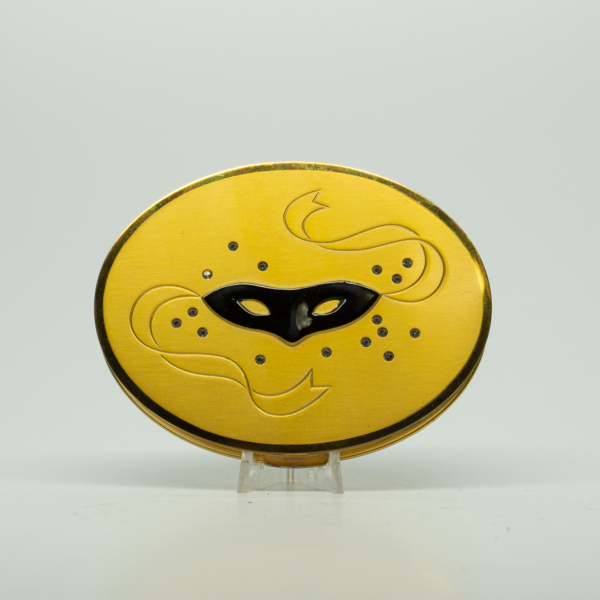 An oval, brass compact featuring a black enamel masquerade mask on its top and a series of concentric rings surrounding the words, "Dorothy Gray," in script on its bottom. Inside is an oval mirror the full diameter of the compact and a powder well.