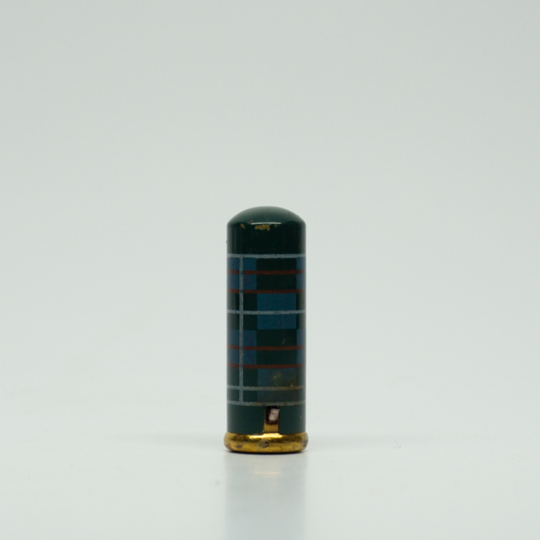 A small, round lipstick tube with a blue, light-blue, dark-green and burgundy plaid enamel pattern on its lid. The bottom of the tube has a shade label with black text reading, "Dorothy Gray Ltd. / Distr. New York / South American."