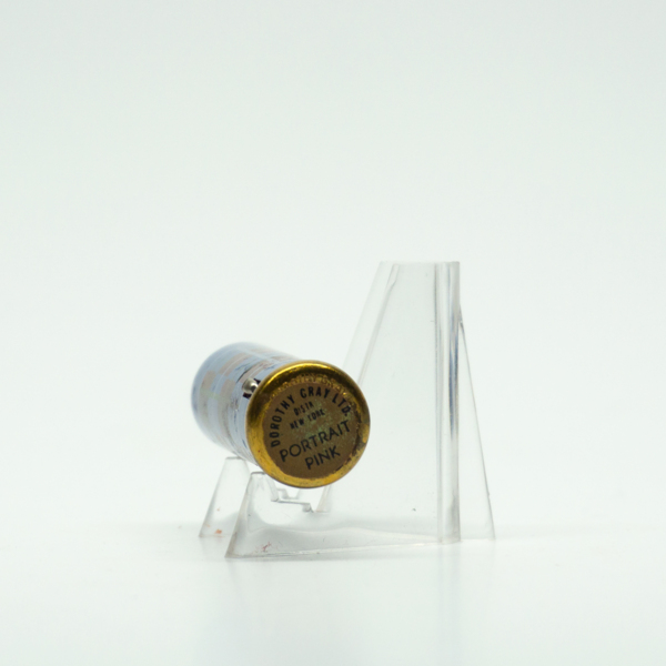 A tapered brass lipstick tube with red enamel. Engraved text on the bottom of the tube reads, "Dorothy gray LTD. / Portrait Pink B / Distribution New York."