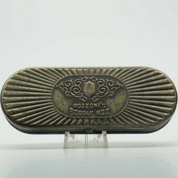 A oval shaped silver compact that is etched with geometric design and filigree at its center engraved text reading, "Pozzoni's Boodle Box." The compact opens on a hinge with a finger clasp. Inside are two product wells on either side of printed text…