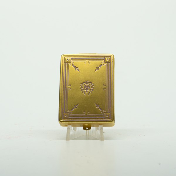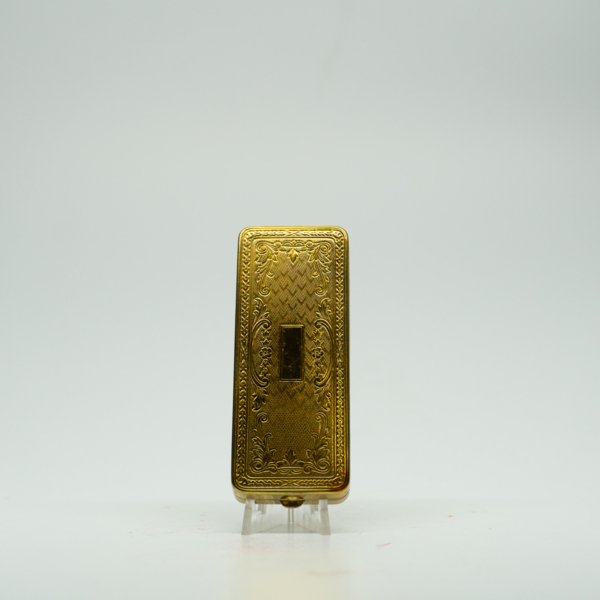 A gold rectangular double compact engraved with filigree inlaid with light purple pigment. The compact opens on a hinge with a finger clasp. Inside, is a lipstick tube engraved, "Melba," and a powder well with a purple silk puff matching the pigment…