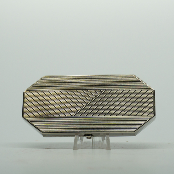 A silver geometric art deco compact that opens on a hinge with a finger clasp. Inside are two powder wells with puffs printed, "Rouge / Pour Blonde," and, "Quelque Fleurs / Houbigant / France / Naturelle." Between the powder wells and puffs is a…
