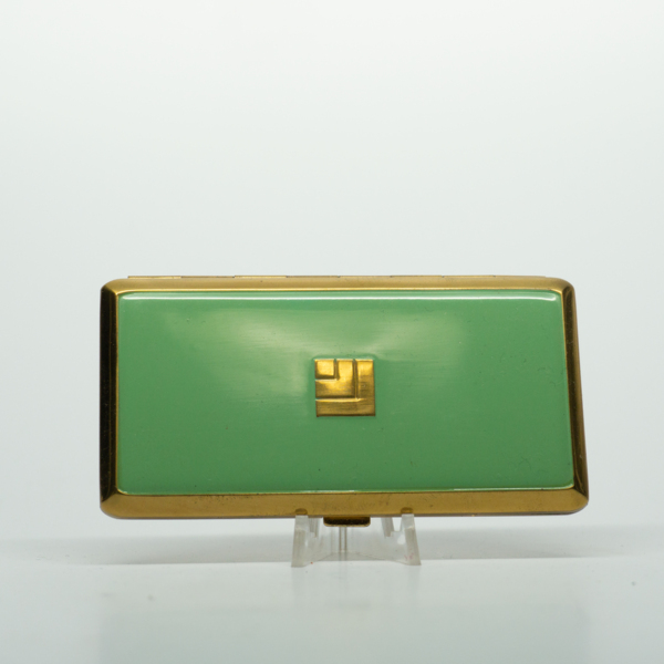 A mint green cardboard box with delicate black branches printed on the top with text reading, "Shari / Langlois / New York." Inside the box is a round rectangular compact with the same mint green enamel top and a gold Lucien Lelong logo in the…